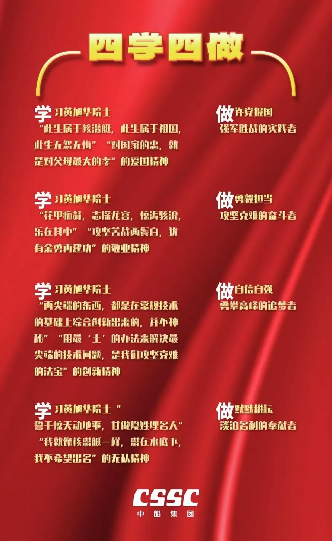 近日,中船集團黨組下發通知,號召全集團深入開展黃旭華院士先進事跡“四學四做”活動。公司全體員工要深入學習宣傳黃旭華院士先進事跡、優秀品格和優良作風,繼承黃旭華院士遺志,弘揚核潛艇精神,賡續中船文化,在新時代新征程中,爭做對黨忠誠、對事業執著的奮進中船人,自覺將個人奮斗融入到中船集團發展大局中,切實將學習活動成效轉化為完成全年任務目標、推動“十四五”圓滿收官的實際成效。